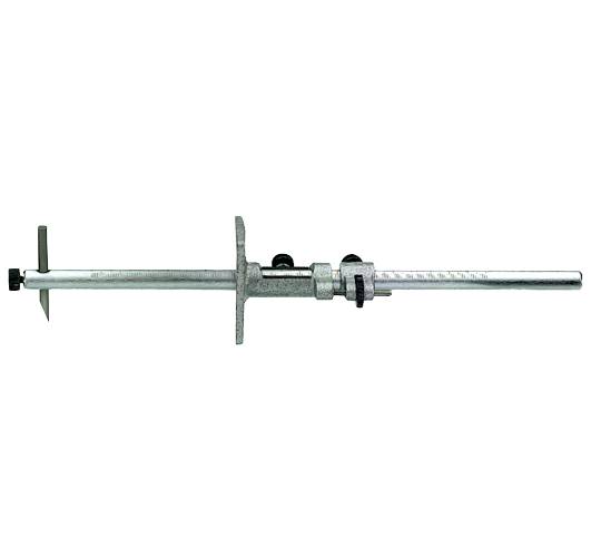 Forkrommet skala og rund stang. Støpt, rundt anslag av støpejern. Utbyttbar rissespiss. Med fininnstilling. Nonieavlesing 0,1 mm.