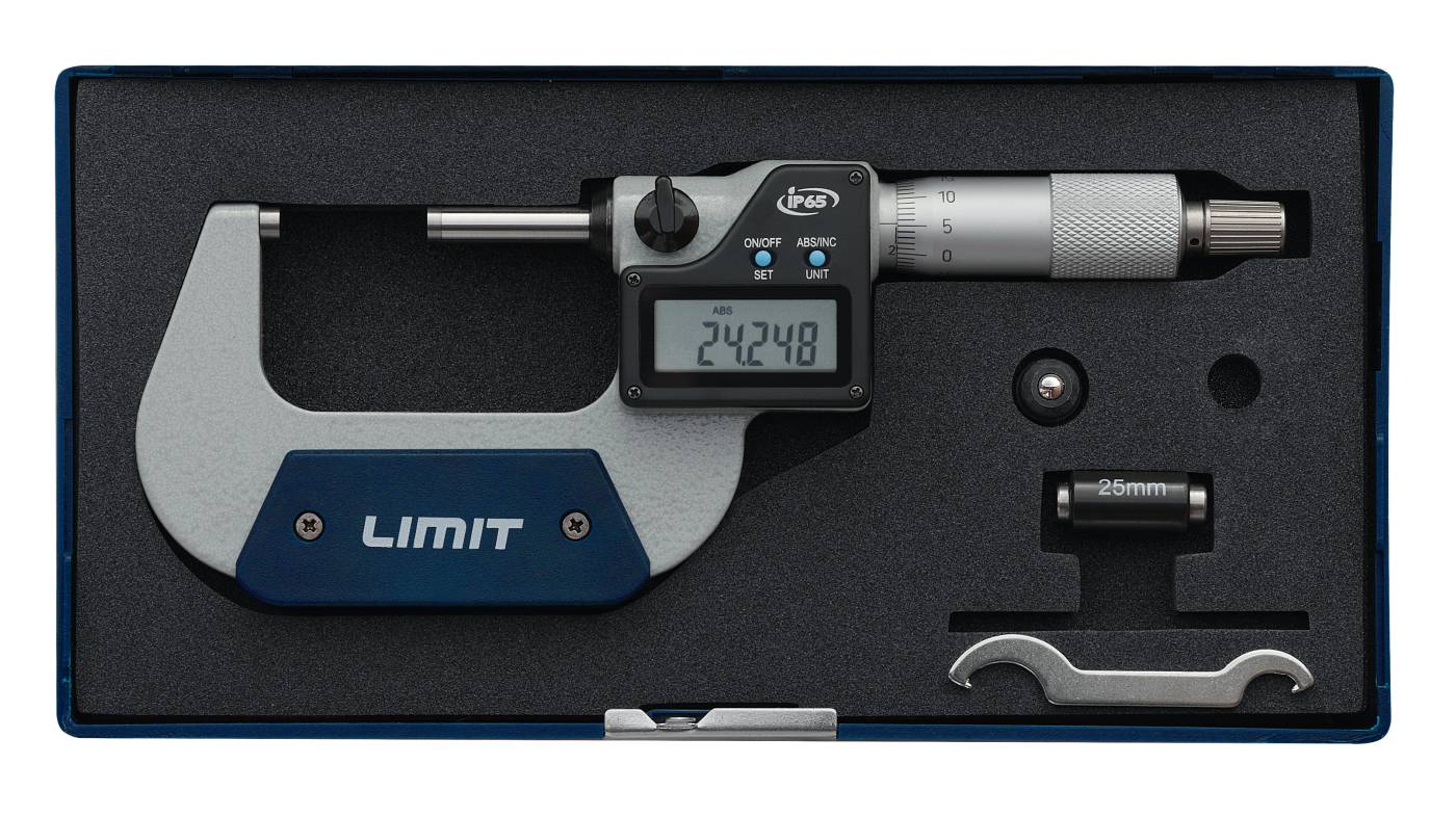 Cyfrowy mikrometr z kabłąkiem odkuwanym, klasa IP65, zapewniający szybki odczyt wyniku pomiaru. Pyło- i wodoodporny. Hartowane wrzeciono z dokładnie docieranymi powierzchniami pomiarowymi z węglików spiekanych. Wyświetlacz LCD z cyframi o wysokości 7.5 mm. Przyciski do włączania/wyłączania i do innych funkcji. Z tuleją ze sprzęgłem ciernym i dźwigienką ustalającą. Wykonanie zgodne z DIN 863. Bateria typu SR44, w załączeniu.