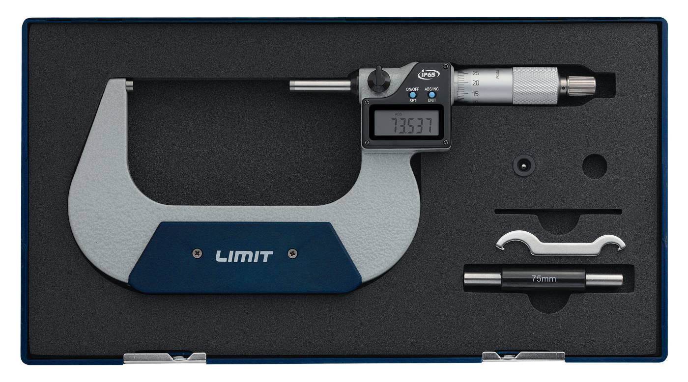 Cyfrowy mikrometr z kabłąkiem odkuwanym, klasa IP65, zapewniający szybki odczyt wyniku pomiaru. Pyło- i wodoodporny. Hartowane wrzeciono z dokładnie docieranymi powierzchniami pomiarowymi z węglików spiekanych. Wyświetlacz LCD z cyframi o wysokości 7.5 mm. Przyciski do włączania/wyłączania i do innych funkcji. Z tuleją ze sprzęgłem ciernym i dźwigienką ustalającą. Wykonanie zgodne z DIN 863. Bateria typu SR44, w załączeniu.