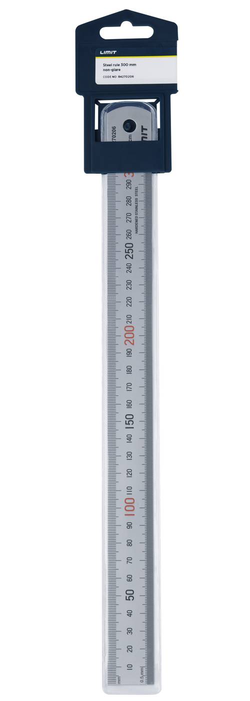 Przymiar kreskowy stalowy z hartowanej stali nierdzewnej. Z powierzchnią chromowaną na mat, zapewniającą bezodblaskowy odczyt. Długości 150, 300 i 600 mm mają podziałkę milimetrową naniesioną przy krawędzi górnej i półmilimetrową przy krawędzi dolnej. Długości 1000, 2000 i 3000 mm mają przy krawędzi górnej, na odcinku pierwszych 100 mm, naniesioną podziałkę półmilimetrową, a przy krawędzi dolnej milimetrową na całej długości. Wszystkie przymiary są wolne od oznaczeń po spodniej stronie.