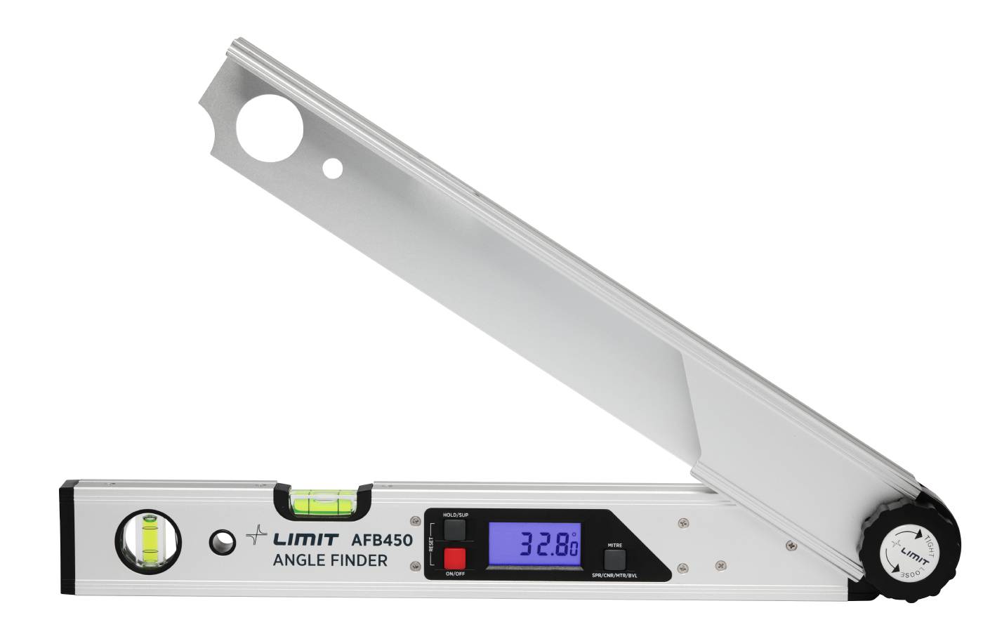 Robust digital angle gauge that measures angles up to 225 degrees and calculates different angles quickly and easily, e.g. supplementary angle, mid angle and miter saw angles. LCD with 12.7 mm large digits that can be rotated through 180 degrees. The display is automatically set to an absolute value but can be reset in all positions. Hold button to freeze the measurement value. The arm is lockable in different positions with a lock handle. Automatic calculation of supplementary angle and mid angle. Cornice module calculates miter saw angles directly by entering the wall angle and the corner angle. Battery type LR03, 2 pcs included.