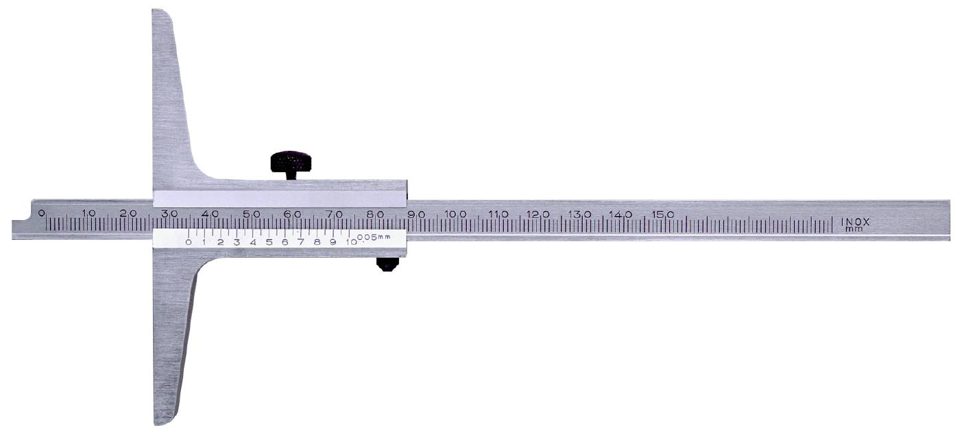 Made of stainless steel. Matt chromium-plated scale. The ends of the blade and the stop are hardened. The scale is graduated in mm with 1/20 mm Vernier. Lockable. Tolerance according to DIN 862.