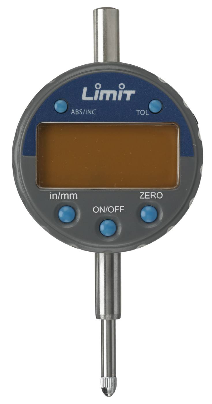 Digital dial gauge. Tolerance function. Switch between absolute and incremental measurements. Zeroing. Switch between metric and imperial. DIN 878. Battery type CR2025, included.