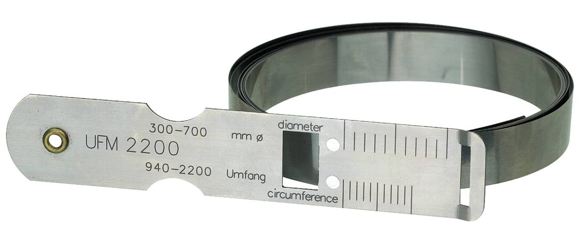 For precision measuring of circumferences and diameters. Manufactured of stainless steel. The tape has double scales for simultaneous reading of circumference and diameter, plus vernier scale for 0.1 mm resolution.