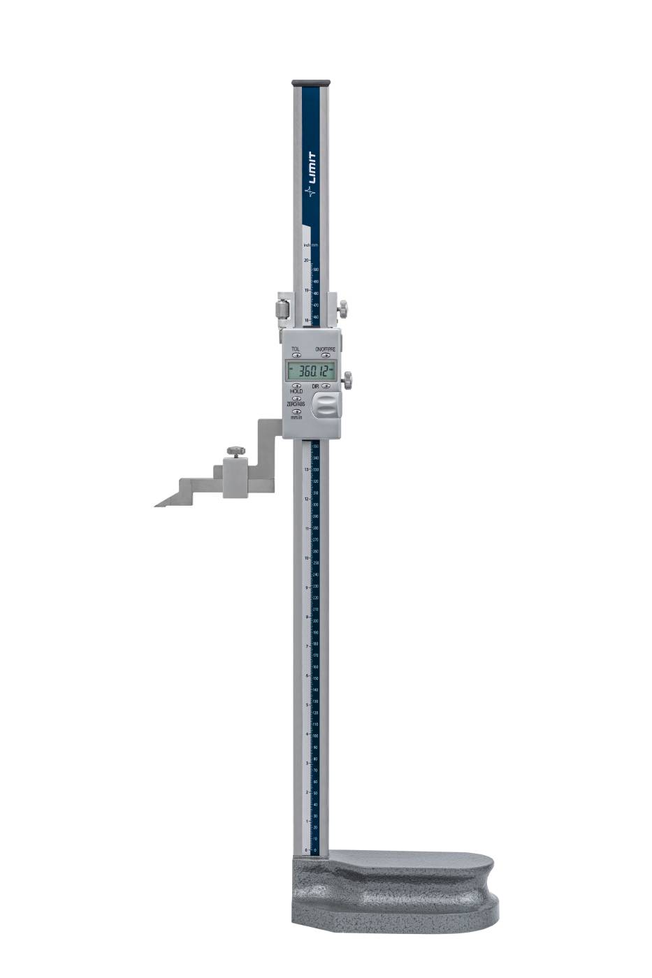 Made of stainless steel. High contrast LCD display. Adjustable measuring direction, switch between metric and imperial. Zeroing button. Hold function. DIN 862. 8 mm attachment for dial gauge included. Dial gauge not included. Battery type CR2032, included.