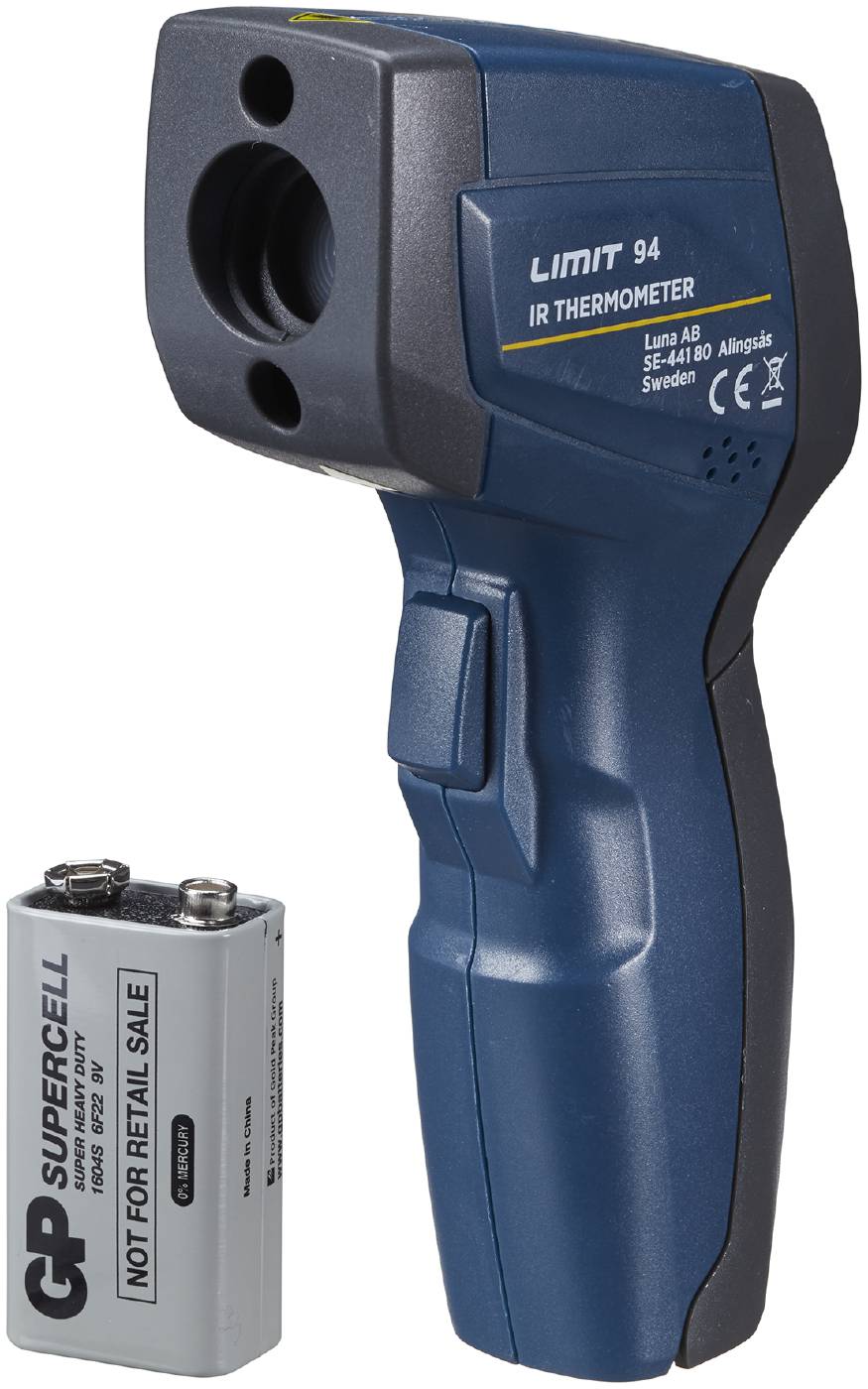 Professional, non-contact infrared thermometer in an ergonomic design. Measures outdoor temperature up to 380°C with high accuracy and quick reading. Reliable measurement thanks to the two laser points that mark the outer edges of the measuring range diameter. D:S factor 12:1. Adjustable emission factor. Records max and min temperatures. Inverted LCD display with 8 mm main digits. Switch between °C and °F. Suitable for the food industry, property, safety and fire inspections, plastic moulding, asphalting, industrial maintenance, etc. 9V battery included.