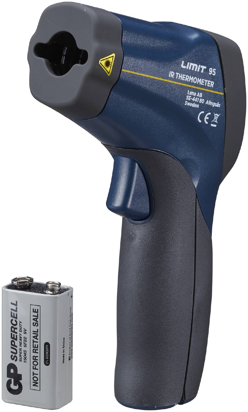 Professional, non-contact infrared thermometer in an ergonomic design. Measures outdoor temperature up to 550°C with high accuracy and quick reading. Reliable measurement thanks to the two laser points that mark the outer edges of the measuring range diameter. D:S factor 12:1. Adjustable emission factor. Records max temperature. Alarm function when a preset value is reached. A special function allows continuous measurement without pressing the trigger. LCD display with 10mm main digits and backlighting. Switch between °C and °F. Suitable for the food industry, property, safety and fire inspections, plastic moulding, asphalting, industrial maintenance, etc. 9V battery included.