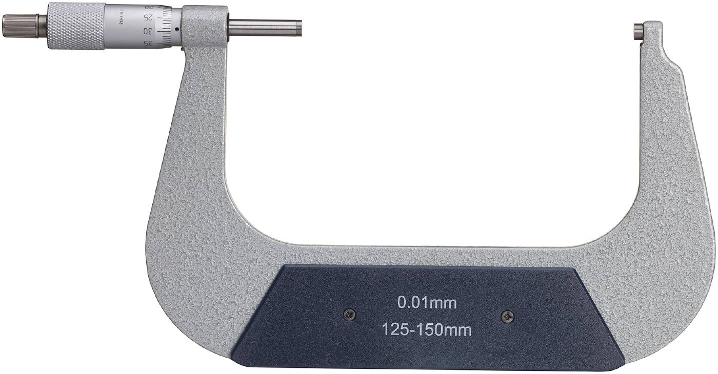 Outside micrometer with painted steel frame and matt chromium-plated scale. Hardened spindle 6.5 mm with fine-polished tungsten carbide measuring faces. Friction screw and lock handle. Manufactured according to DIN 863.