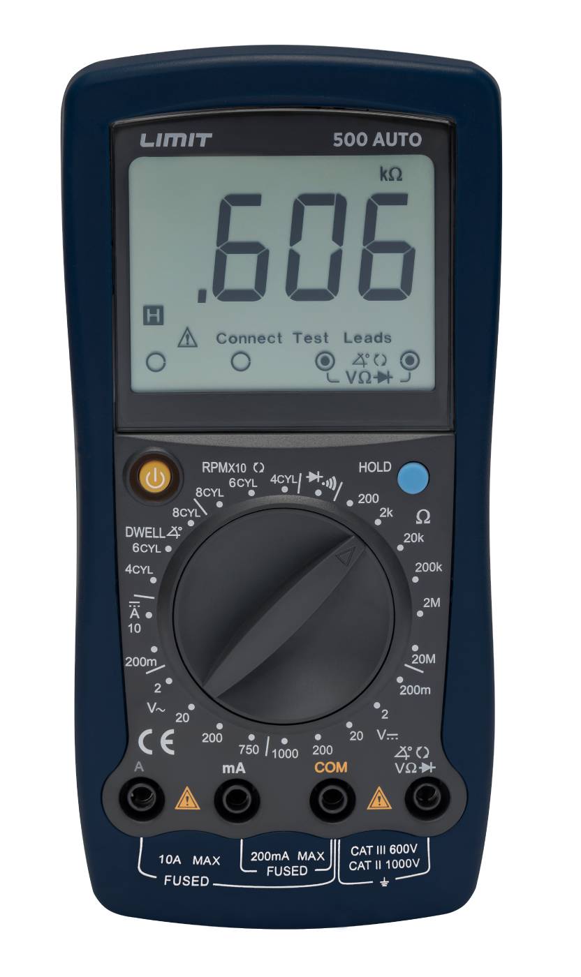 Digital automotive multimeter. Suitable for cars, boats, motor mechanics. Large display that even assigns the right cable socket and selected measurement range. For measuring direct/alternating voltage, DC, resistance, cam angle and speed. Also diode test, continuity test with buzzer, data hold, battery capacity warning. Supplied complete with test cables, batteries and Swedish and Norwegian user guide. Rubber cover and fold-out bench support. Scale length 1999. Insulation CAT II 1000 V / CAT III 600 V according to IEC 61010. Fuse protected to 10 A.