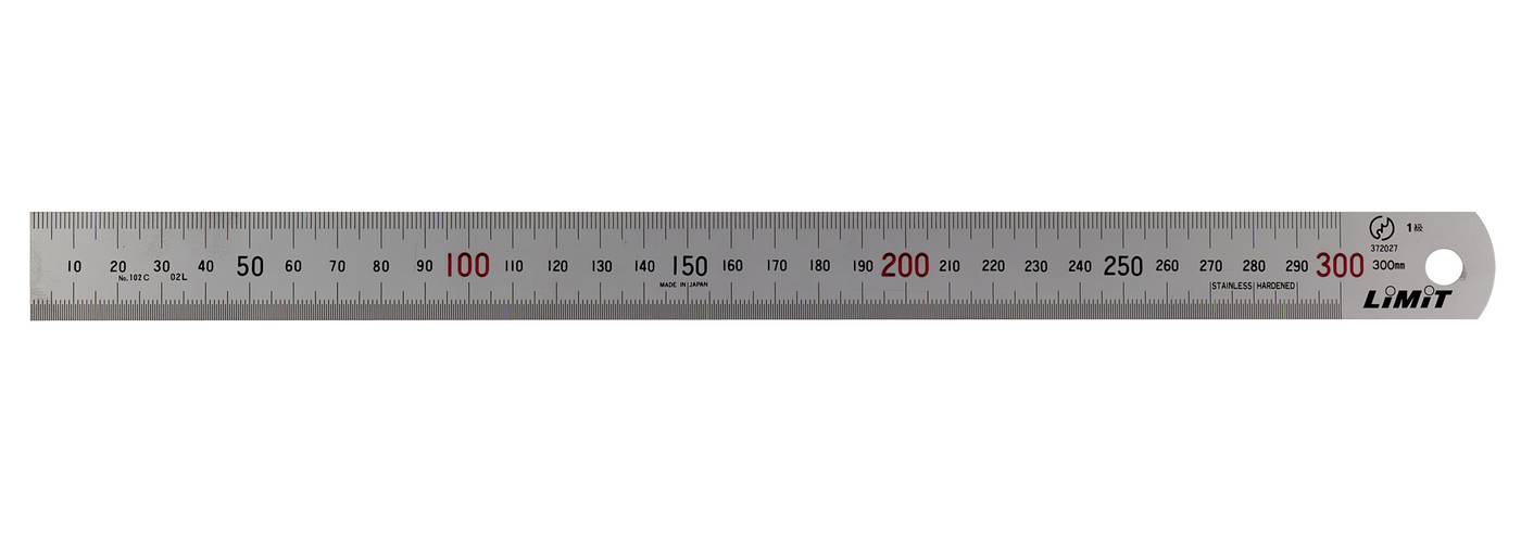Steel rule made of hardened stainless steel. Matt chromium-plated finish for glare-free reading. Lengths 150, 300 and 600 mm are graduated in millimetres on the top edge and half millimetres on the bottom. Lengths 1000, 2000 and 3000 mm are graduated in half millimetres on the top edge up to 100 mm and then in whole millimetres. The bottom edge is graduated in whole millimetres along the entire length. All rules have a blank back side.