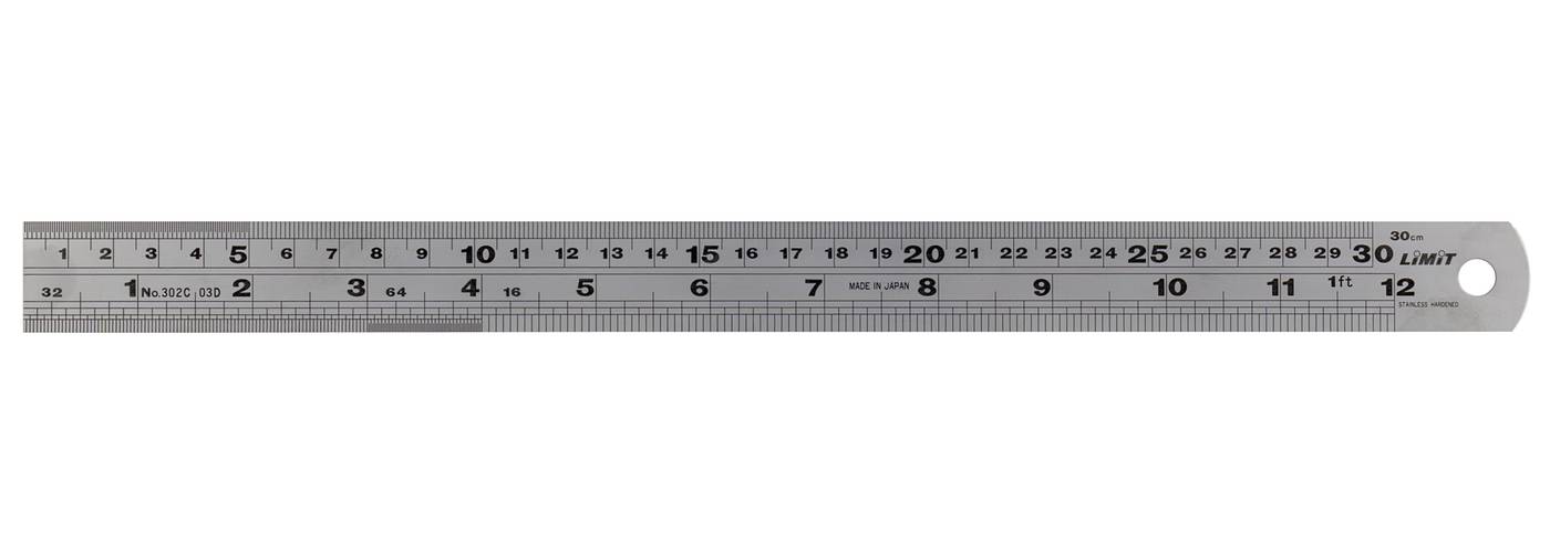 Hardened stainless steel. Matt chromium-plated, non-glare scale. Graduated on one side - top in mm/mm, bottom in inches.