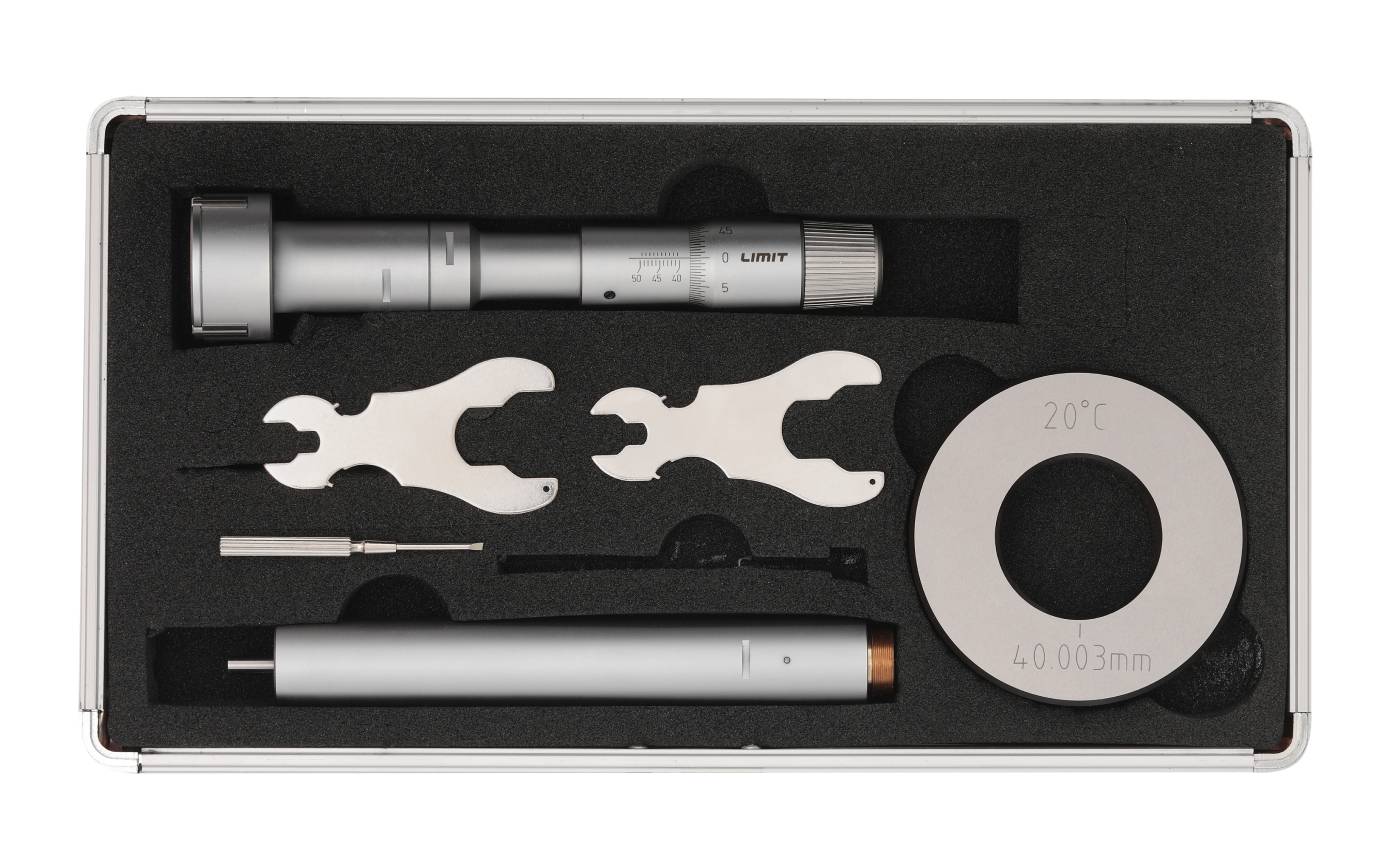 Three-point micrometer and kits designed for hole measurements. With a friction device that provides a constant measuring force and self-centres the device. Measuring surfaces made of tungsten carbide. The measurement tips reach down to 0.5 mm from the bottom of a blind hole. Setting ring included. One set includes 4 micrometers x 20-50 mm the other set 4 micrometers x 63-100 mm, plus 2 setting rings in each set. Supplied with an extension piece and setting ring. Manufactured according to DIN 863/4.