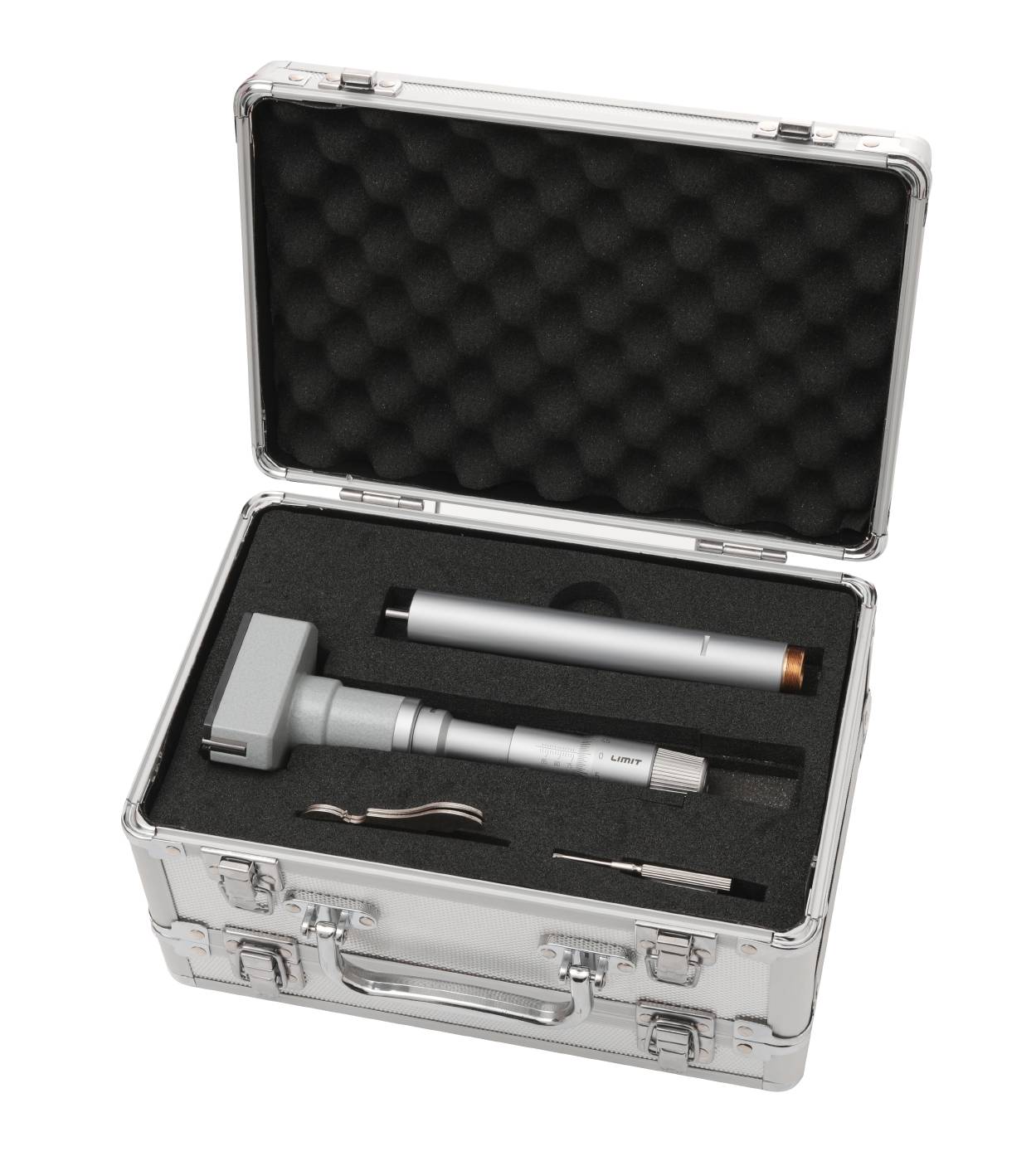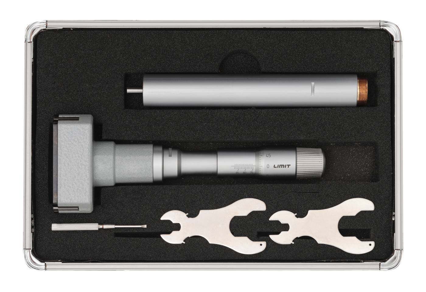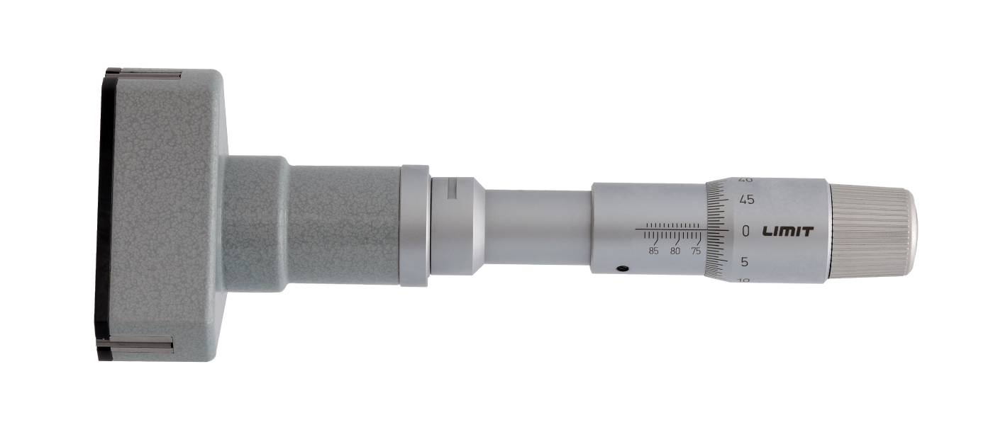 Three-point micrometer and kits designed for hole measurements. With a friction device that provides a constant measuring force and self-centres the device. Measuring surfaces made of tungsten carbide. The measurement tips reach down to 0.5 mm from the bottom of a blind hole. Setting ring included. One set includes 4 micrometers x 20-50 mm the other set 4 micrometers x 63-100 mm, plus 2 setting rings in each set. Supplied with an extension piece and setting ring. Manufactured according to DIN 863/4.