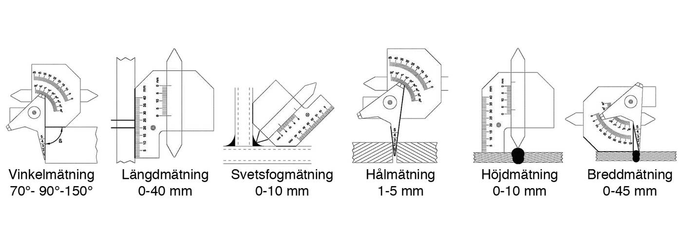 For measuring of welding joints in corner. Heights of welding joints. Height gauge. Material thickness. Angle measuring. Distance between plates. Hole diameter. Supplied in plastic wallet.