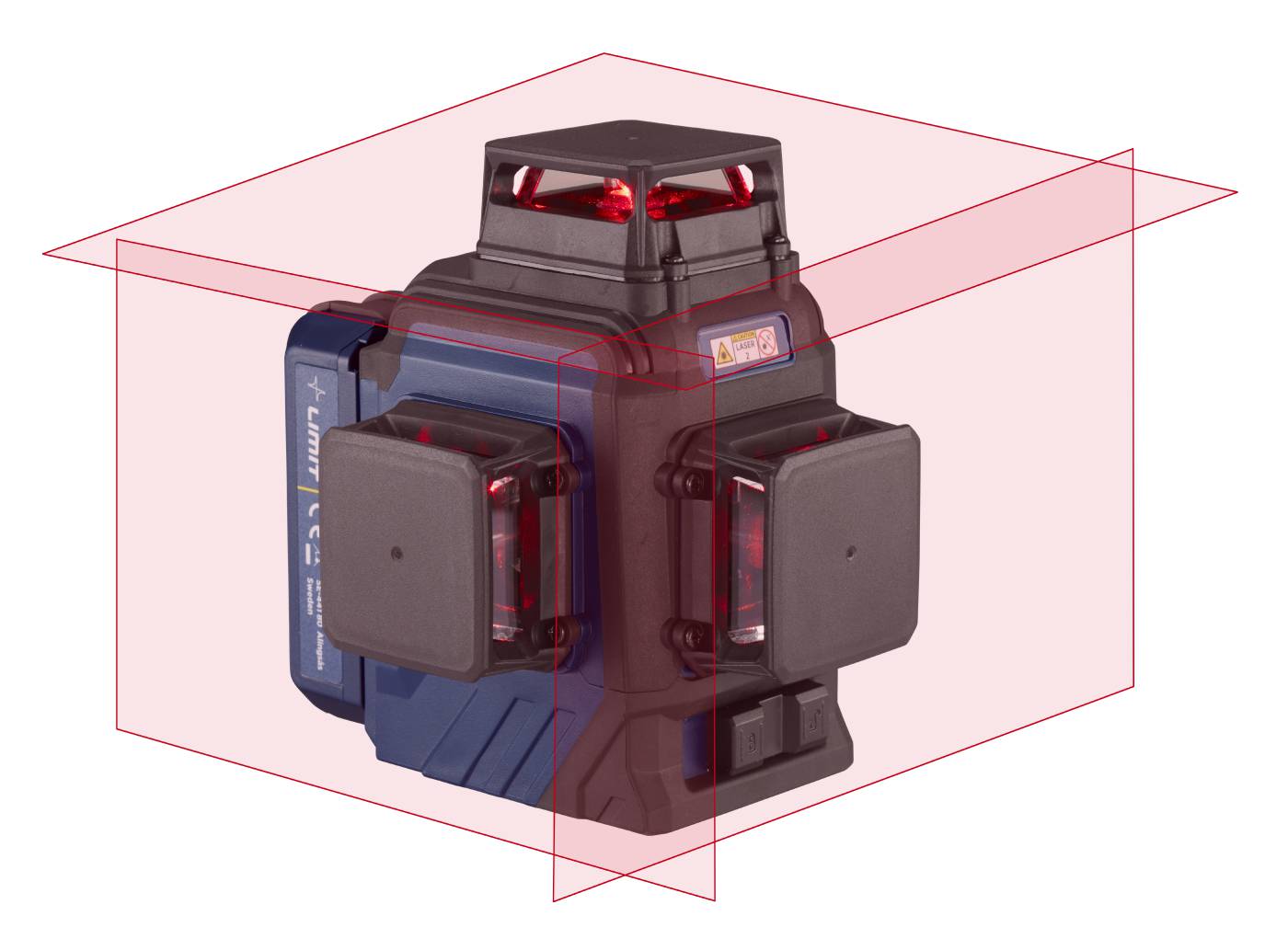 Multikorslaser med rött laserljus som visar tre mycket ljusstarka 360°-linjer.
